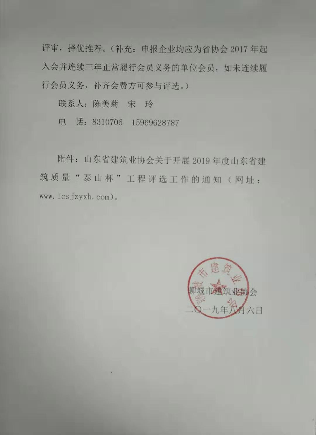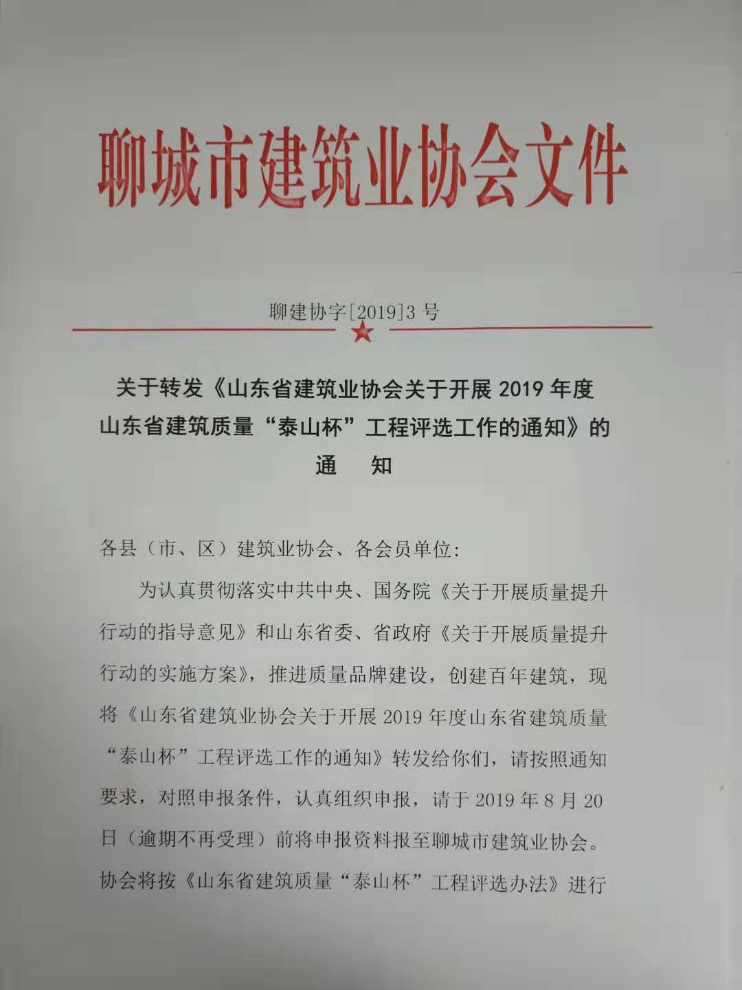關于轉發(fā)《山東省建筑業(yè)協(xié)會關于開展2019年度 山東省建筑質量 “泰山杯”工程評選工作的通知》的通 知
