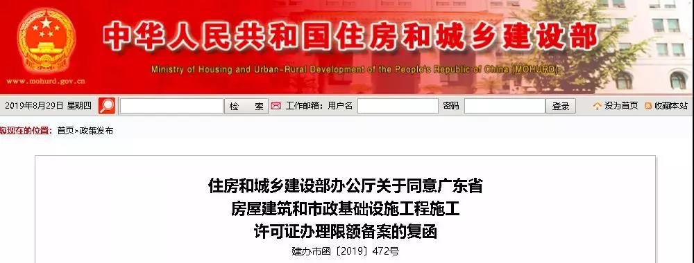 2019年8月16日,住房和城鄉(xiāng)建設(shè)部辦公廳復(fù)函廣東省住建廳,同意其《關(guān)于申請(qǐng)廣東省房屋建筑和市政基礎(chǔ)設(shè)施工程施工許可證辦理限額備案的請(qǐng)示》,并予以備案。